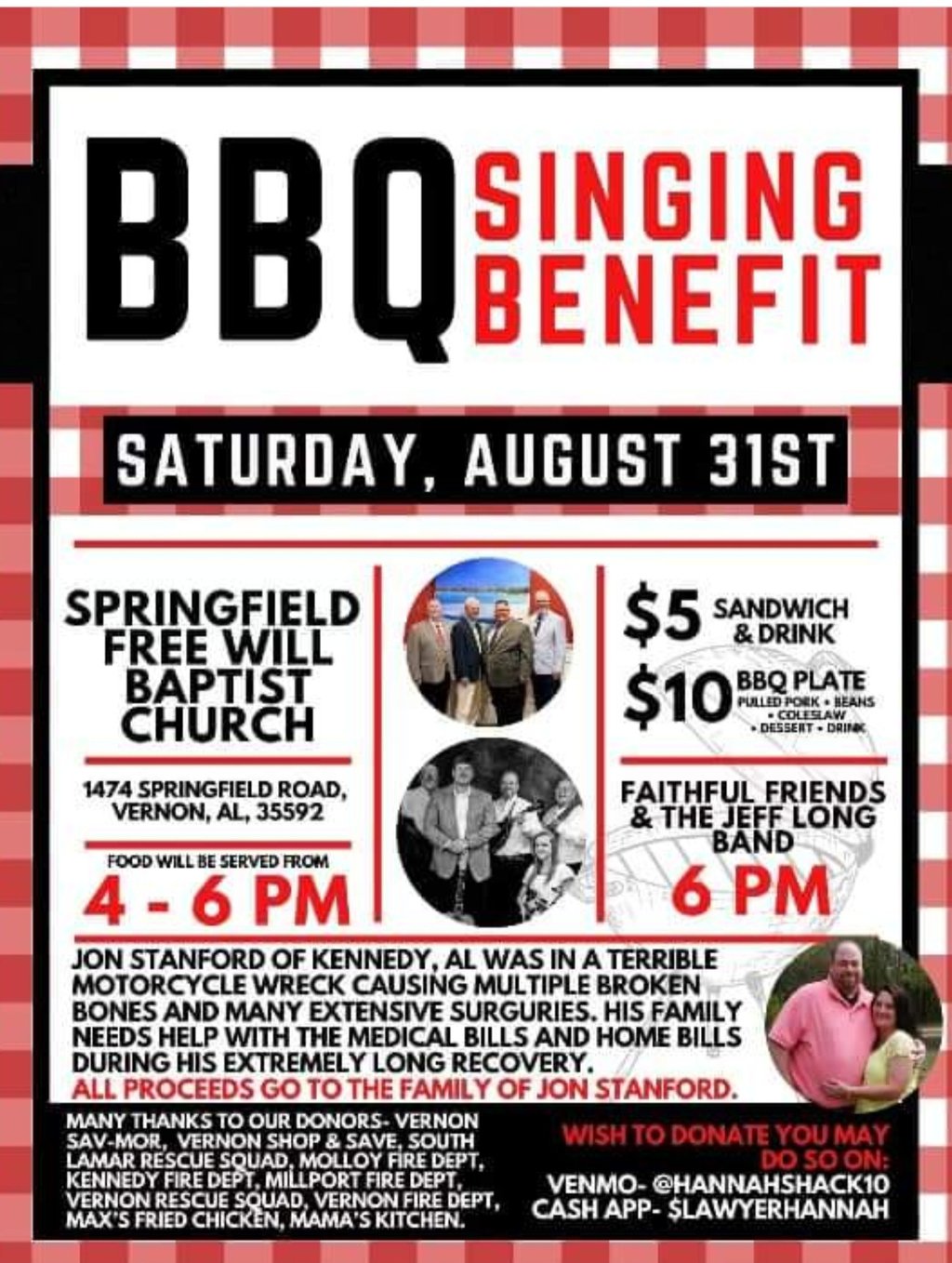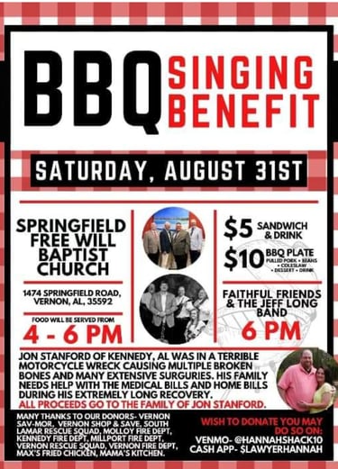 Join Springfield Freewill in supporting Jon and his family after a motorcycle accident. $5 Sandwich $10 Plate on Saturday Aug 31 from 4-6 with music after.